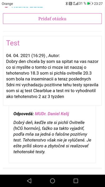 Ahojte baby poradte prosim 18.3 som si pichla ovitrelle a 20.3 som podstupila inseminaciu vcera to bolo presne 17dni od pichnutia ovitrelle a 15dni od samotneho zakroku a vysli mi pozitivne testy aj clearblue myslite ze to moze byt este zostatok s ovitirelle Dakujem za precitanie a nasledne odpovede