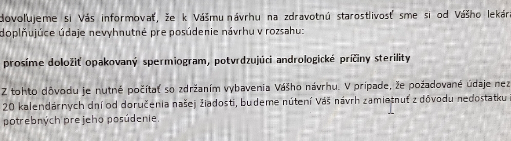 @bobulkapetka vo vseobecnej zdravotnej som.mna to len caka tak zistujem bola som na prvej konzultacii s tam zistili ze mam zrasty a vajecniky zdeformovane troska po neliecenom zapale a priatel ma spermiogram sice dobry ale tvar spermii je zly maju deformaciu hlaviciek .teraz 17 ma caka este hormonalny profil a potom dalsia konzultacia a tam sa asi rozhodne na isto co dalej aj ked doktor povedal ze v nasom pripade to prirodzene bohuzial nepojde.