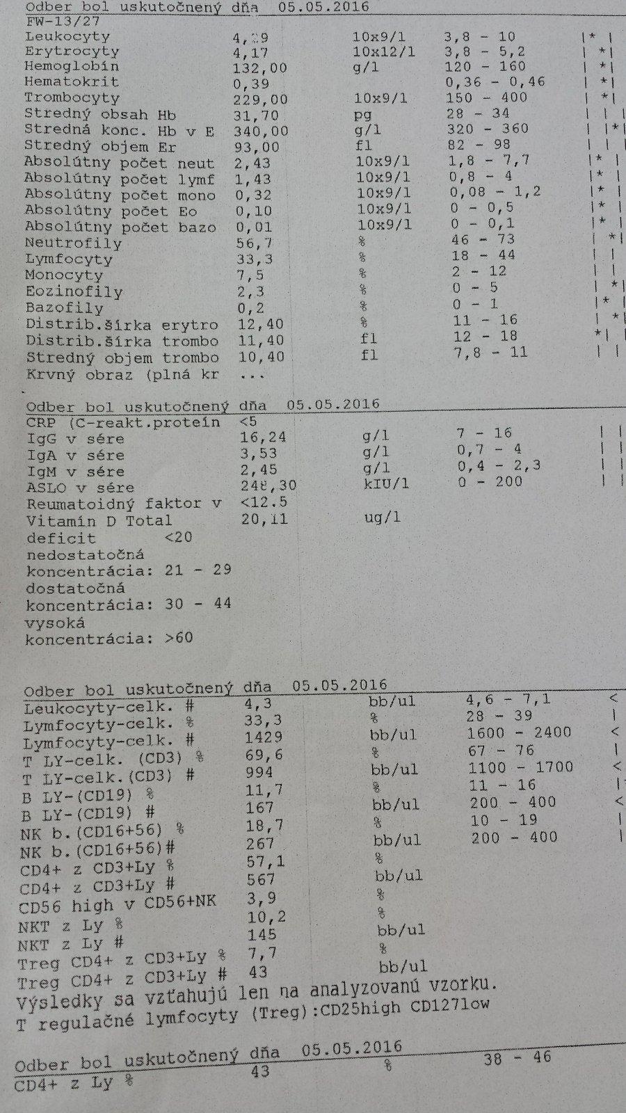 Tak už aj ja mám výsledky. Preukázaná špecifická celulárna odpoveď voči trofoblastu ľahkého stupňa, Hranične zvýšené zastúpenie NK buniek v periférnej krvi, Hypovitaminóza vitamínu D 25 (OH). Čo poviete? Nie je to až také zlé? Mám brať Dexamed inj 10*2 ml/8 mg. 2*týždenne počas prvých 2 týždňov a následne znížiť na 1*týždenne intramuskulárne. Aký D vitamín si mám kúpiť a kde? Aký je najlepší? Vďaka 😉