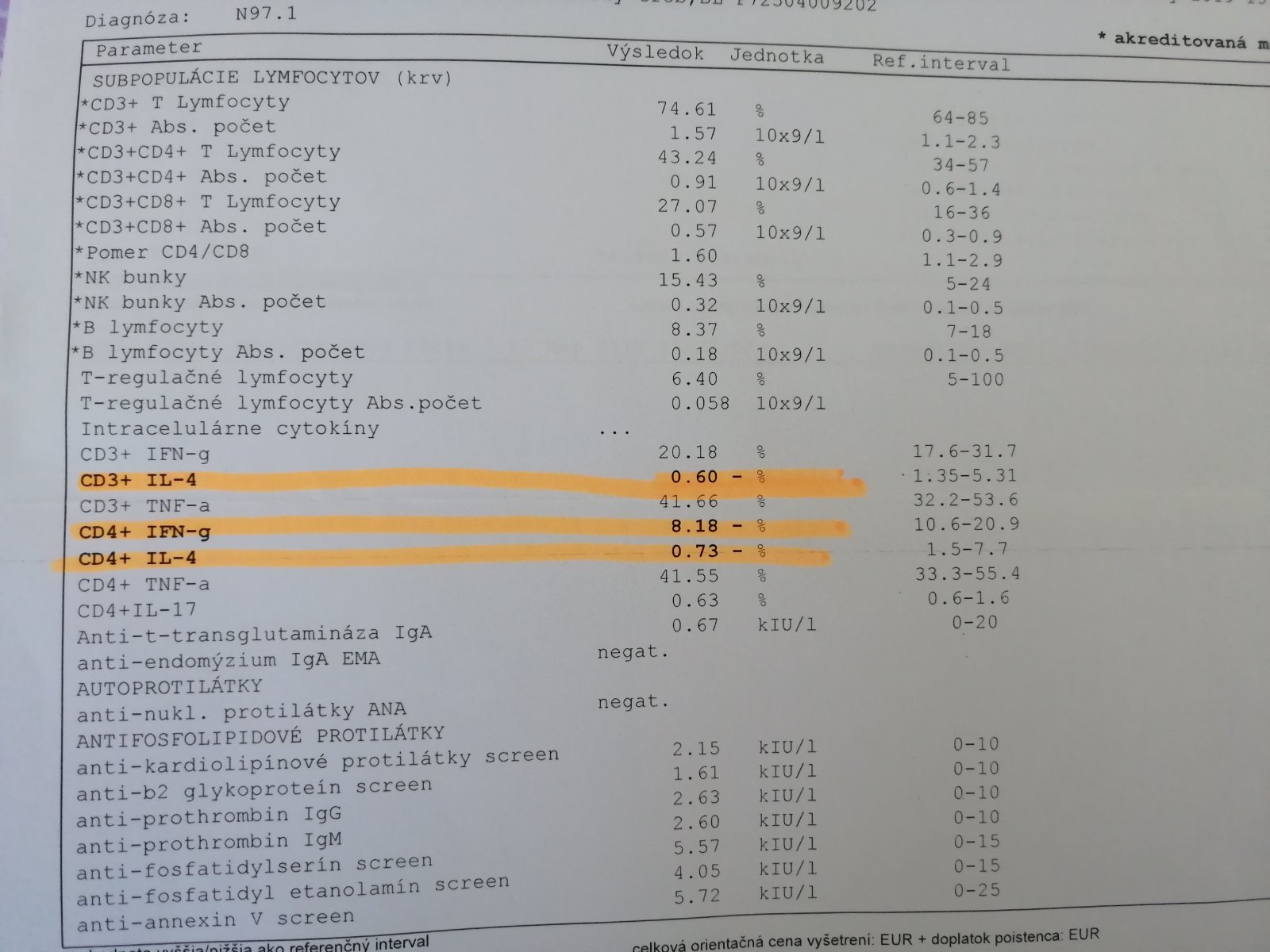 Ahojte dievcata, prosim vas, vcera som dostala do ruk tieto vysledky z reproimuno, ktore mi dal urobit moj gynekolog. Kedze sam povedal, ze ich citat nevie a doporucil mi objednat sa na interpretaciu do Imunovitalu, chcela som vas len poprosit pred tym ako tam vobec dostanem termin, ci mi viete niektora povedat, co znamenaju tie zvyraznene nizke hodnoty. Neviem sa k nicomu zatial dopatrat...dakujem krasne 🙂