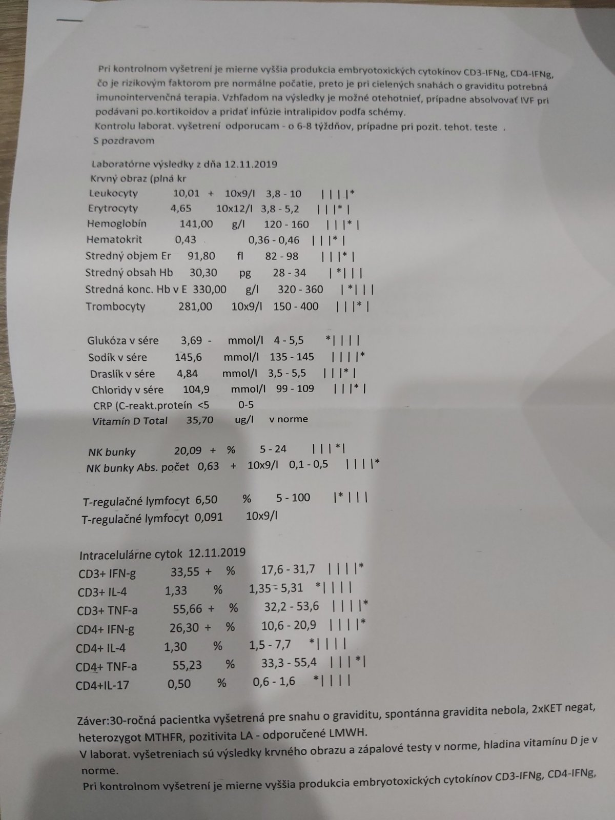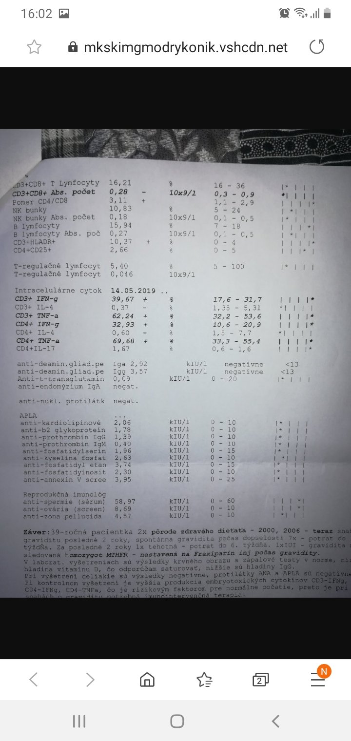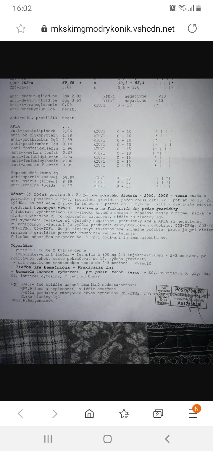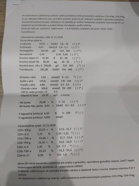 @butterfly333 ahoj, na cytokiny mi nezabralo nic. Stale som ich mala vyssie ako by mali byt. Vlastne liecbu som zacala az po tom, co som 2x potratila, vzdy do 10tt. Zacala som chodit do BA do Imunovitalu, kde mi dr nasadila medrol. Ten som brala cca tristvrte roka, cytokiny klesli o nieco, ale iba malo. Kvôli strasnym neziaducim ucinkom sme ho vysadili. O cca pol roka som si dala urobit vysetrenie v NR, neviem, nejakym zázrakom vyslo, ze vsetko mam OK, ale ked som 3krat otehotnela, potratila som zase. Po tomto som uz zacala riesit iscare, kde mi zobrali krv a zase zistili zvysene cytokiny a povedali, ze aj keby som chcela, oni mi vklad neurobia, ze najskôr musim znizit cytokiny. Ako mi toto povedali, tak asi o tyzden som zistila, ze som 4krat tehotna, to som bola iba 4tt. Rychlo som zacala riesit gynekológa, imunológa, hematológa, a iscare. Gynekolog ma dal hned na PNku, imunologicka v NR nasadila infuzie (prvýkrát Flebogamma, a dalsie 3tyzdne Privigen), hematologicka inj. Clexane, iscare Progesterone 200...Samozrejme vitamin D a kyselinu listovu. A nieco z toho muselo pomoct, lebo aj ked som mala najvyssie hodnoty cytokínov v case otehotnenia, mame babatko. 🙂