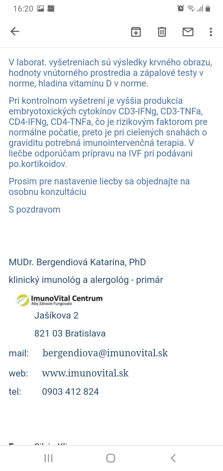 Baby mám otázku minulý rok som mala zvyšene cytokiny nízke iGg malo vit D brala som igamplia injekcie teraz som bola na kontrolný odber a výsledky ešte horšie cytokiny stúpli. Dali mi medrol ale nenapísala mi že mi stopli ivf koli cytokinom len že treba liečbu medrolom a ešte niečo . Chcem sa spýtať keby mi nepovolia koli tomu ivf to by mi napisala? Zajtra tam idem pre medrol ivf by malo byť apríli.