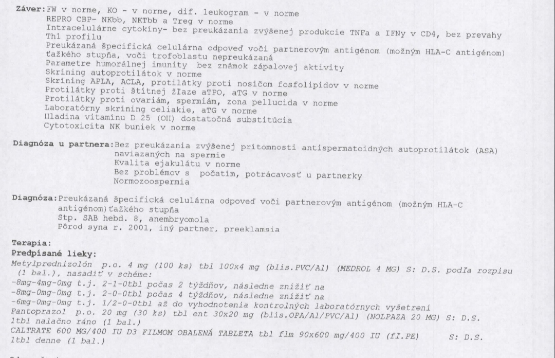 Ahojte, po dvoch neúspešných tehotenstvách nám začal kolotoč vyšetrení, a v NR Dzurilla nám zistili špecifickú celulárnu odpoveď voči partnerovým antigenom HLA-C antigenom, ťažkého stupňa. Nasadený mám medrol 12mg prvé dva týždne a potom znižujeme. Po 8 týždňoch kontrolné odbery. Podarilo sa vám donosiť bábätko s touto diagnózou. Prikladám aj záver lekárske správy. Ďakujem veľmi pekne.