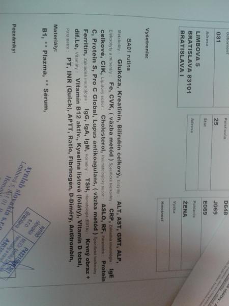 @tlucka dnes som na teba myslela, ako si dopadla. Ja som jej tiez vcera pisala mail s mojimi vysledkami a odpisala mi, ze by to radsej presla osobne. Este cakam na dodatocne vysetrenia a pojdem za nou. Ked som tak narychlo kukla, tak si tam mala viac veci ako ja. Dala ti vysetrit aj vitamin D? Som si myslela, ze sa to da len na imunologii. 😀