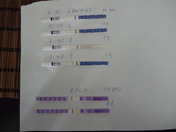 tak tu je to 🙂 🙂 😀 😀 ... sfotila som vam este testy tie dva dole co su, to je z nevydareneho tehu... ja len ze na 11dpo teraz som mala taku ciarku ako predtym na 17dpo.... ale to asi nie je take podstatne.., hcg stupa asi inak pri kazdom tehu... neviem... dolezite ale je ze mi teraz ciarka sili a pekne .. hcg bude urcite vyssie ako v tamtom tehu 🙂