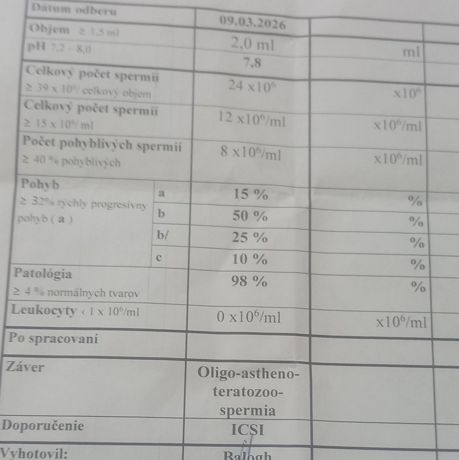 Ahojte, prosim Vas mala by som zacat stimulovat zajtra ale podla MS. Partner bol na kontrolom spermiograme a dopadol zatial najhorsie ako mohol objem zo 43 mil na 13 mil, morfologia z 3% na 0.5% a fragmentacia z 24% na 30% prosim mali ste to niekto podobne a aj tak ste mali uspesne oplodnene vajicka ?