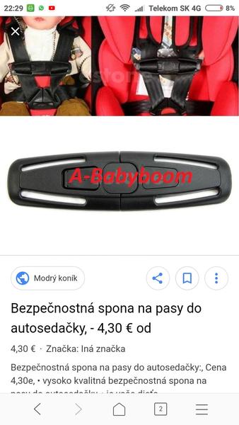 @romiada a s tou sponou vyššie opatrne, nie je to otestované, dokonca v prípade nehody je príliš veľký tlak na hrudník dieťaťa. Ten tlak môže byť taký, že dieťatku môžw zlomiť niektoré z rebier a plúca prepichne. Myslím, že jedinú sponu ktorú testovali bola tá od besafe a aj pri nej odborníci dvíhajú varovný prst. Dosť som to študovala, keďže sme mali ten istý problém a prvé čo ma napadlo... "aha aká spona, super kúpme ju" hovorila som mužovy a potom keď som si trochu o tom čítala odborné články (mimo predajcov, lebo tí predajú asi všetko a napíšu čo vyhovuje im) tak sme sa rozmysleli, že radšej nie.