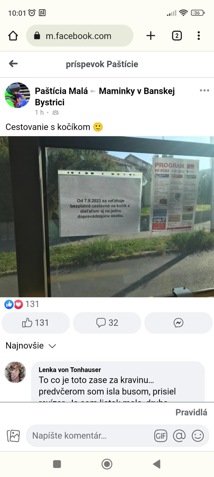 Cestovanie MHD v BB s kočíkom. Od nepamäti doprovod dieťaťa v kočíku alebo babyvaku neplatil. Pred dvoma rokmi z oficiálneho cenníka toto privilégium vypustili, ale lístky si doprovod kupovať nemusel ( revízori sami tvrdili, že si matky lístky nekupujú, rovnako to tvrdili zamestnanci na dopravnej kancelárií aj vodiči autobusov). V polovici augusta začali revízori požadovať lístky aj od doprovodu ( zatiaľ len s upozornením, bez pokuty) . Od 1.9. Sa začalo pokutovať. Dnes opäť na cestujúcich vyskakuje v autobusoch toto . Šoféri nikdy neprestali tvrdiť, že doprovod sa prepravuje zdarma. Mesto nevie dať oficiálne vyjadrenie ( ak nerátame komentár pána Noska v jednej diskusnej skupine). Je toto možné v jednom meste v ktorom sa hrdia modernizáciou MHD?