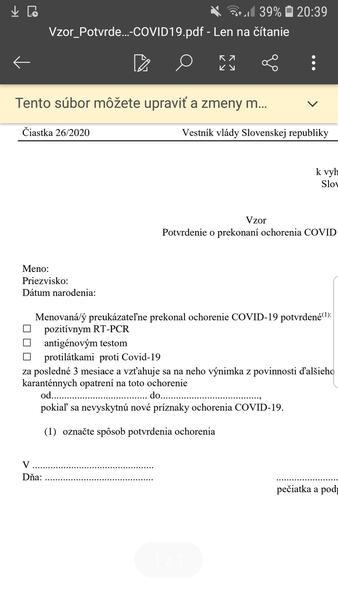 @olinka242424 neviem ci si to niekto zoberie na triko. na zaklade protilatkoveho testu sa nema davat toto potvrdenie. teoreticky jedinym potvrdenim staci byt pozitivny vysledok testu nie starsi ako 90 dni