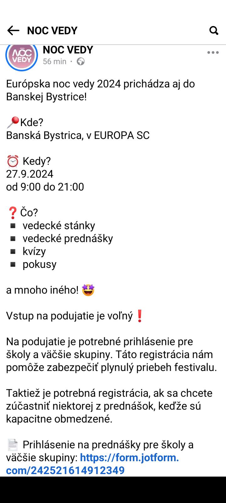 Kočky prosím vás,neviete náhodou čo je to za akciu v nc Europa 20.9-piatok https://www.nocvedy.sk/.Našli sme to na nete,a nás to velmi zaujalo teda dcéru-teenegerku,ale je to uz od 9.00-20.00 v piatok,či je to skor pre školy určené,alebo tam mozme príst ako aj na výlet len rodina s dcérou,okolo obeda ked jej skončí škola,nie sme priamo z bb, ale juh slovenska. Nemáte skúsenost?....nepočuli ste niečo o tom?, prípadne je to prvý rok,či to bývalo aj roky predtým?.....Ďakujem za každú radu, skúsenosť.