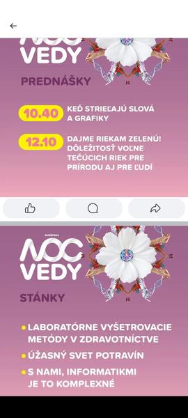 Je to každý rok, stánky s interaktívnymi ukážkami a pokusmi z biológie, chémie, matematiky, fyziky, techniky,... sú postavené v uličkách obchodného centra a decká sa na to môžu pozrieť, skúsiť si pokusy, zapojiť sa do súťaží a podobne. Niektorí učitelia prírodovedných predmetov berú žiakov na toto podujatie už doobedu ako exkurziu, ale je to akcia pre širokú verejnosť, takže po škole sa môžete kľudne ísť rodičia s dcérou pozrieť. Ja som chodila celú strednú aj vysokú školu na Noc vedy v Košiciach a vždy tam bolo niečo zaujímavé 😊