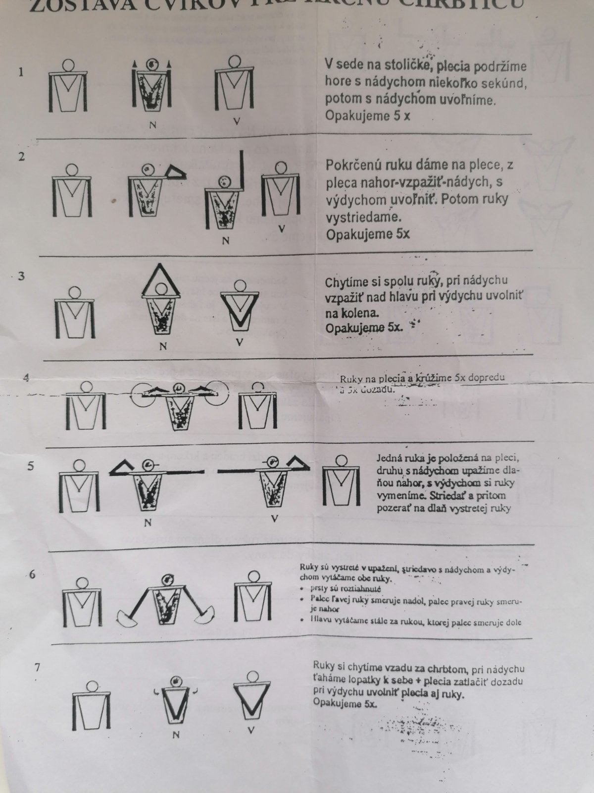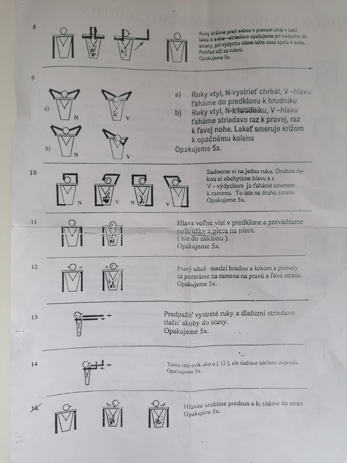 Ahojte, hľadám niekoho, kto pracuje buď na rehabilitačnom v nemocnici (tam kde sa cvičí) alebo u Mudr. Semričovej. Pred pár rokmi som dostala na papieri "zostavu cvikov pre krčnú chrbticu" (15 cvikov) v nemocnici, kde ma učili dané cviky realizovať a na tom papieri je pečiatka Mudr. Semričovej. Neviete náhodou z akej knihy to je? prikladám fotku časti tých cvikov. Tieto cviky mi nesmierne pomáhajú a hľadám zdroj, keďže zaujímajú ma aj iné cviky na inú časť tela, keďže ma trápi aj hrudná a bedrová časť. Ďakujem za pomoc