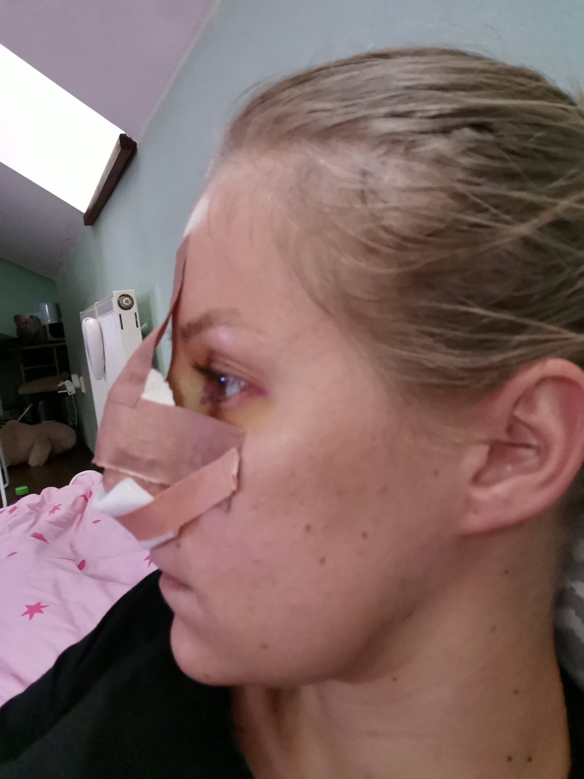 Som 4den po operácii a tým pádom že mi opuchol nos tak sa dlaha úplne nadvihla a vôbec nesedí takže si ju tam musím ako tak priložiť a pre lepiť. Pridávam aj foto.