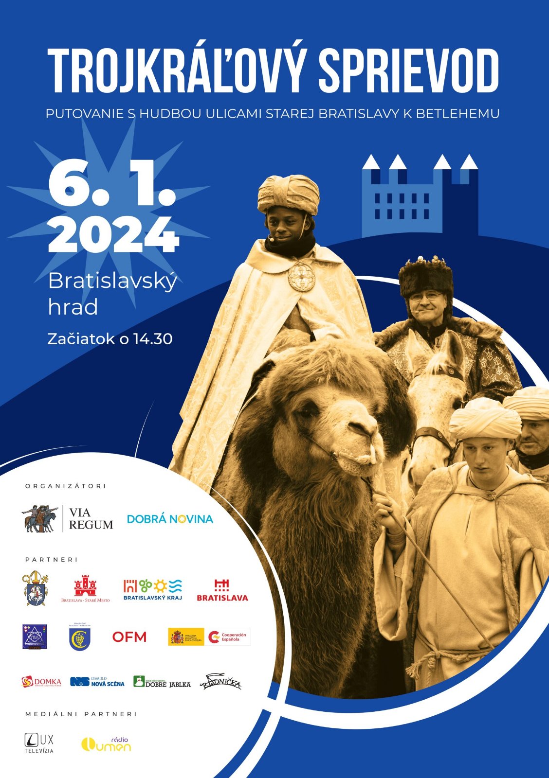 Trojkráľový sprievod v BA 6.1.2024 o 14.30h Mudrci z ďalekých končín, reprezentujúci príslušníkov troch generácií a troch kontinentov, zavítajú do hlavného mesta Slovenska na koňoch a na ťave. Sprevádzať ich budú bubeníci, gajdoši a koledníci. Cestu im zas ukážu malí hviezdonosci.Sprievod sa vydá na cestu z nádvoria Bratislavského hradu o pol tretej popoludní. Odtiaľ môžete nasledovať troch kráľov na ich ceste za hviezdou, ceste plnej prekvapení. Pokračovať budú cez Palisády do stredovekého centra mesta, symbolizujúceho Jeruzalem, cesta skončí na Hlavnom námestí premenenom na betlehemskú stajňu, kde mudrci nájdu malého kráľa. Nasledujúci koncert dodá hravému podujatiu ďalší autentický nádych. V mnohých hlavných mestách Európy sa na sviatok Troch kráľov usporadúva výpravný sprievod ulicami. V sobotu 6. januára sa preto po štvrtý raz v duchu dávnych tradícií európskeho kontinentu uskutoční trojkráľový sprievod aj v Bratislave. Vstup volny. Vsetci ste pozvani!