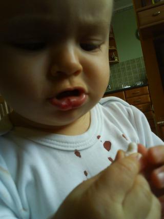 Prehrýzla si peru škaredo a krvičky bolo všade.Plakali sme obe.Kuk foto už po všetkom,ked už bolo dobre (ešte má tričko pokvapkané) 😢 :