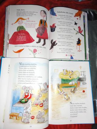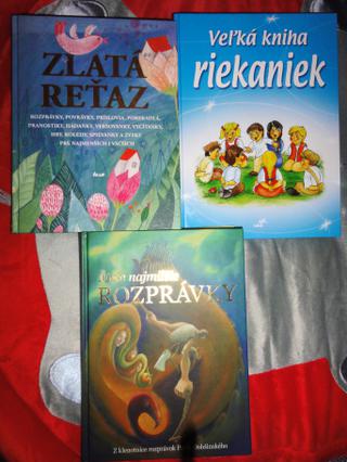 Ja som jej kupila take tri skvele knihy, chcem vam ich dat do pozornosti, ak by ste aj vy hladali nejaku studnu ludovych rozpravok, riekaniek, porekadiel..... Jedna uzasna kniha: ZLATA RETAZ od Ikaru, zostavila a upravila: Elena Slobodova - su tam Rozpravky, povravky, prislovia, porekadla, pranostiky, hadanky, versovanky, vycitanky, hry, koledy, spievanky a zvyky pre najmensich i vacsich. Je neskutocne krasne ilustrovana (velmi vkusne nic gycove) - na obrazku je to ta otvorena kniha hore a potom to zelene.... Je velmi hruba 297stran, no je to investicia na cely zivot 🙂. Druha kniha je VELKA KNIHA RIEKANIEK, zostavila: Mária Štefánková - tam su ilustracie nie velmi vkusne, ale na citanie riekaniek to staci 🙂, ja som ich vsetky zabudla a tam su fakt vsetky co poznam a dlho som si na ne nemohla spomenut.... a tretia kniha su rozpravky Dobsinskeho, vola sa MOJE NAJMILSIE ROZPRAVKY - vsetky tie zname ludove rozpravky... 🙂 tiez velmi hruba kniha.... to pomaly budem malej citat viac a viac, aby mi zaspala v postielke... aj ked teraz mi to absolutne nejde.... mne zaspava len na rukach a myslim ze jej rastu zuby, vpravo hore ma na dasne take tvrde a je to tam aj biele trochu.... tak asi preto tak plakava casto pred vecerom... tak neviem ako to ma vyzerat ked rastie zubok.....