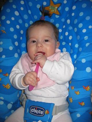 ahojte dievcata. my uz na obed a na olovrant spapame 100ml a niekedy aj viac, ked chuti. Uz potom nekojim, len dam zapit cajikom (rada od mudr). Kasicku na veceru nedavame, lebo mala este nema ani pol roka a uz ma 8200g ( vid foto 😀 ) tak musime opatrnejsie na nu, aby nam moc nepribrala 🙂 inak uz papame vsetko, jablcko, hrusku, banan, mrkvu, brokolicu (ta je naj), kalerab, zemiak, cuketku (ta je nic moc) a dnes budeme papat porik so zemiacikom a kuracim maskom 🙂 a uz davame aj avokado a straaaaaasne nam chuti 🙂 baby ako ste na tom s chudnutim po porode? ja uz som musela nieco so sebou robit, lebo na to moje chabe telo sa uz nedalo pozerat, tak teraz chodime na baby fitness sa trosku potrapit 🙂 mala sa mi tam vzdy tak unavi, ze potom spi aj 3 hod. vkuse 😀