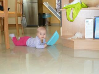 Vcera ma krpanka prekvapila a docuvala mi do kuchyne a hned zacala upratovat, no neni zlata 😵 Uz som si aj myslela, ze zacne lozit, ale jej sa lubi stale len dozadu a uz teda zvladne riadnu streku. Pekne sa nam dava na styri a cvici, aj striesku robi, za chvilku ju budem asi nahanat po celom byte 😀