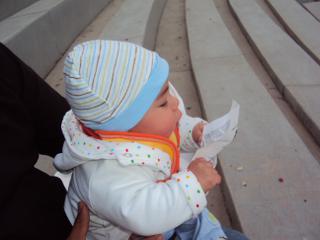 zaklad je davat ho tam ked je uplne spokojny a vesely a potom nech odtial pozoruje nieco zaujimave- nejaky obraz alebo tak. ja vzdy vybehnem von a to len cuci jak kengurka odtial. a len co zacne mrncat dam ho von.