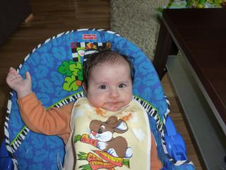 okolo 10:00 dostava vyzivku, alebo postruhane jablcko, okolo 13:00 dostane polievocku a vecer cca 20:00 dostane kasicku. Medzitym si pyta mliecko.