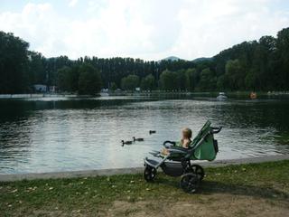 @bobocka Myslím, že ty si nedávno písala, vraj raz odmerali v bazéne 60% moču a 40% vody. Tak to je podľa mňa pekná blbosť, veď tá voda by smrdela a nikto by do nej nevliezol. Netvrdím, že bola hygiena vždy v poriadku, len toto sa mi zdá prehnané. V detskom bazéne vyzerá voda dosť kadejako a možno aj "močoidne", lenže to je minerálna voda a preto je tak sfarbená. V starom detskom bazéne urobili teraz platené atrakcie. Jazero je úplne úžasné, neviem, či teraz aj vodu nemenili, lebo bola úplne priezračná, žiadne riasy a povlaky. Keď sa človek pozrie od bazénov na jazero s kačkami a smutnými vŕbami okolo, no veru neviem, či je v niektorom meste krajšie. Úplne perfektné na prechádzku s kočíkom, keď má dieťa spať. Je tam kľud, tieň. Aj piesková pláž je bohová, stále sa chystám, že tam pôjdeme s vedierkom a formičkami, len zatiaľ nevydalo, lebo Emka by len vo vode chcela byť. Minule sa tam nejaký chlap vybláznil a postavil 2-metrového chameleóna - dám foto na FB. Alebo aj sem. V stánkoch predávajú aj normálne obedné menu za necelé 3 euri, dá sa sadnúť do tieňa pod prístreškom.