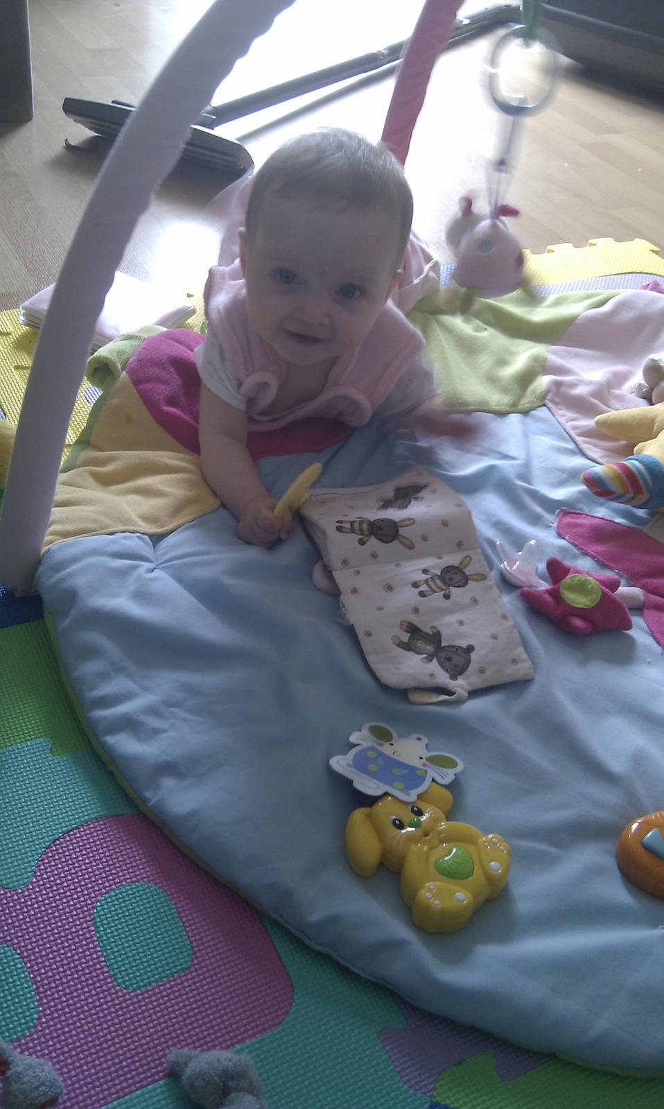my máme puzzle na zemi v obývačke v troch vrstvách na sebe a na tom mám takú hrazdo-ohrádku- je to hrazda a na bokoch sú nafukovacie valce, aby dieťa nevyliezlo von, má to asi 1x1m a malá sa v tom super váľa 🙂 má tam detský klavír a komponuje 😀