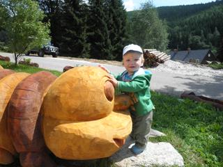 My se dovolenkujeme od soboty. Ubytování máme v Malé Úpě, přímo v centru pohádkových stezek Krkonoš. Kdo chce super tip na dovolenou s dětmi, vřele doporučuji. Jsme ve výchozím bodě krásných procházek asfaltovou cestou, dobře sjízdnou pro kočárky. Je možné dělat několik okruhů po okolí lesem a sbírat body na pohádkových zastaveních při cestě. Letos to tu jen obšlápnem a myslím, že za 2 roky už by to bylo to pravé ořechové pro našeho drobka. Všechny penziony v okolí jsou zařízené pro děti, hrací koutky, postýlky, hřiště, ovečky, atd. Kubíček svou první dovolenou zvládá skvěle. Co zjistil chuť borůvek, tak jen lozíme po stráních a jsme modří až za ušima 😀 S mm jsme zvolnili v tůrách, už se nehoníme s těžkým batohem po kopcích, ale užíváme se všichni 3 navzájem. A ten vzdoušek co tu je! 🙂