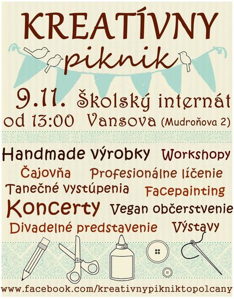 Tento druhý Kreatívny piknik, na ktorom sa stretnete s kreatívnymi ľuďmi a spoznáte ich prácu, sa bude konať dňa 9.11.2014 od 13:00 v budove školského internátu Vansova a bude ako inak ZADARMO. 🙂