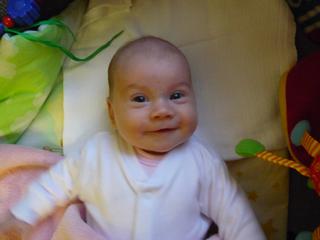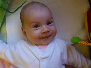 takto sa my usmievame 🙂 Mala je zlaticko 😉 Malo co placka uz od narodenia a je fakt ukazkova xixi prajem kazdemu taketo babatko 😀 Jaj no uz by som mala prestat ju vychvalovat,ze? Stale cakam,ze pride to obdobie placu a problemov so spinkanim.....