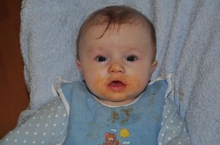 No a tá Hippka mrkvová, je fajná, išiel sa za ňou zabiť. Dala som mu najskôr len štvrť sklenky, lebo všetci mi hovorili, že "to mu dáš 10 lyžičiek a zje ti všeho-všudy možno dve" - ha,ha,ha, to nepoznajú môjho synátora, ten sa urazil, keď som mu išla zohriať ďalšiu porciu, že ako to, že to nemá hneď? Zlatý bol, fakt na zjedenie. Takže zjedol nakoniec celú tú fľaštičku - na prvý pokus celkom úspech.