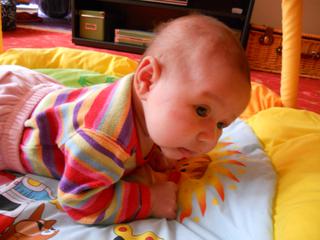 Takhle zvedáme hlavičku 🙂 paní dr říkala, že když tohle budeme umět ve třech měsících, tak bude spokojená :D