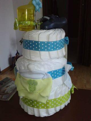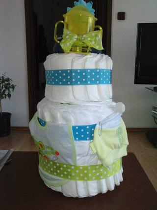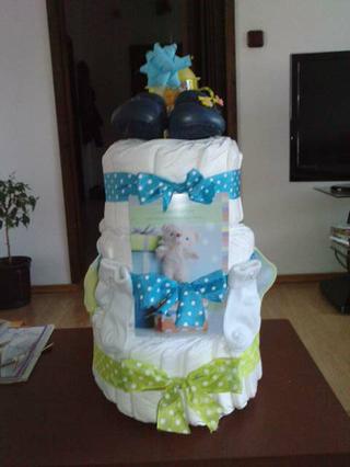 aaaa baby zvladla som to moja prva plienkova torta pre moje krstna davidka 🙂 ale na to,ze som ju robila 1krat vyzera celkom fajn,nie? tu je......
