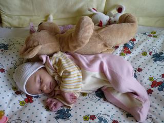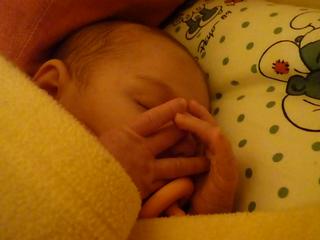 no u nás zatiaľ metóda s uterákom okolo hlavičky nezabrala - teda včera vôbec, dnes možno trošku, ale som to upravila, zmotala som deku, vytvorila také U, do toho vložila malý vankúšik a na ten som položila Natálku. kraje toho vankúšika sú zdvihnuté, lebo po nimi je tá deka a takto je v tom zababušená. (píšem ako somár, ale snáď sa to dá pochopiť). dnes po obede som ju tam šupla, síce ešte chviľku plakala o dušu, ale potom zaspinkala, tak uvidíme, či to pomáha.