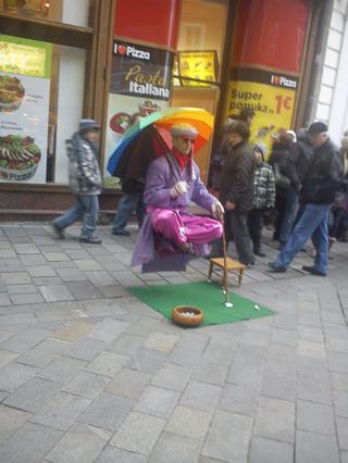 @lolko_lenka co ma tu palicku, tak tu ma na pevno v zemi a ako sa jej drzi, tak z nej mu ide do rukava nejaka tyc, kt. mu musi ist nejako okolo pasu, proste je na nu zaveseny.....presne neviem na akom principe to funguje, lebo pod saty som mu nevidela, ale proste ho to drzi......ziadne zazraky....ale je zase macher, ze si to vymyslel, lebo ludia mu tam hadzali 5,10,20 eurovky.....aj ja som najprv cumela, ze ako to dokaze, ale ako sme isli naspat, tak sa mu zrovna troska vyhrnul rukav.....a videla som to, hned si to upravoval.