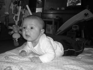 takhle jsme se před týdnem vyfotili jak už se zvedáme na loktíčky a jak se nám líbí starší bráška..