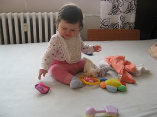 Rozoberáte pretáčanie, lozenie a sedenie - Hanička sa pretáča ako raketa ale občas si zabudne ručičku pod sebou a hups je otočená nazad a vtedy sa náramne čuduje 😀Pretáča sa z chrbátika na bruško, ale už sa podarilo aj opačne. Prelozí celú manželskú posteľ ale to je náhodné preguľovanie. Loziť nelozí iba zodvihne riťušku ale predok nevládze zodvihnúť. Sedieť tiež ešte nedokáže bez opory ak tak len pár sekúnd.