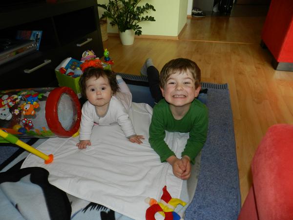 Pripajam fotku mojich ratolesti. Syn ma poriadne mono pod okom-natankoval do lavicky🙂. Kristinka prikrmy velmi papat nechce, ale nevzdavame sa🙂 Sediet este nesedime.