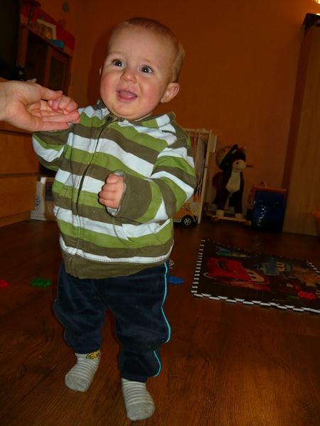 takto u nás vypadají ""hodiny stání" .. je to šikulda.. už vydrží i chvilku stát úplně sám bez držení až se sama divím! ale tuhle jsem ho pozorovala jak se ozvednul o postel, pustil se a hrál si s autíčkem, ale než jsem ho vyfotila tak si mě všimnul a chytil se... škoda!!!! ale když ho pustím, tak vydrží, ale jak vidí foťák tak se po něm hrozně chtivě hrabe, takže se nám zatím foto nepovedlo.. máme jen takové