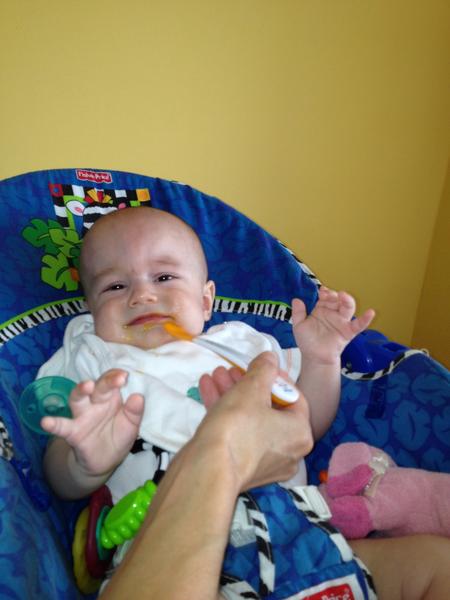 Stále krásne papá aj keď mu nechutí a strasie ho, tak ďalšiu lyžičku je s nádejou na niečo lepšie.