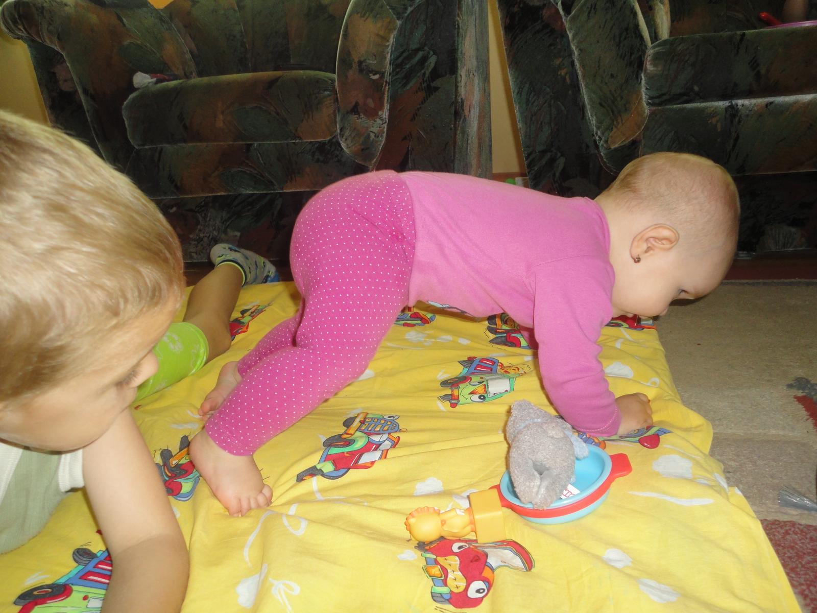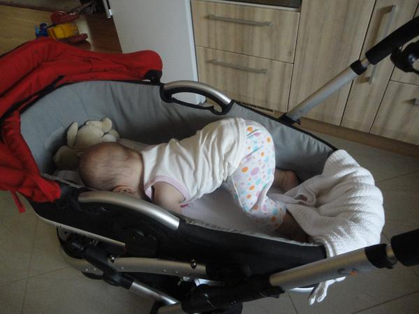 prvykrat zletel asi pred 2 tyzdnami, vtedy som zistila, ako sa vie pretacat a plazit, ale to som vedela, ze bol hore, len som od neho odisla... asi bude musiet cez den spavat v malej postielke...