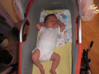 @oacka aj my spime vacsinou v kociku cez den v postielke je hned hore a v kociku spi.....ale co su to za moresy ze po nacuckani ked ju polozim na postel je hned hore a na rukach je klud.....