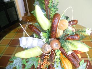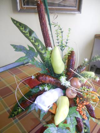 my sme dnes boli na 40-tke, gulasik, pecene prasiatko,,,vsetko v prirode,,bolo super, Emmu si podavali z ruk do ruk, evidentne jej to nevadilo,akurat mna nejako bolia nohy,,a toto je kytica z klobas- napad @maxara a @monline - dakujem zan baby- mala fakt uspech, az na to, ze mi bola kurevsky tazka,ked som ju viazala, az mam teraz svalovicu 😀 tak kuk ako som sa s nou potrapila,nahlad z predu,zo stran a detail, plus pridavam foto par pestunov Emmy a osalavenec,,,,