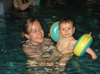 tak my mame za sebou prvu hodinu plavania...najprv chceli, aby sme sa len pozerali cvachtajuc pomaly vo vode a uvidime ako bude yoan reagovat...a on ani nezamrnkal, tak sme sa hned zapajali do vsetkch aktivit, len bol miestami trosku vyhukany zo vsetkych tych novych podnetov a ludi okolo neho...potom si uzil paradnu masaz, ktoru predviedli na nom a este sme ani k autu neprisli a uz spal clarisse na pleci 🙂