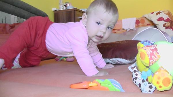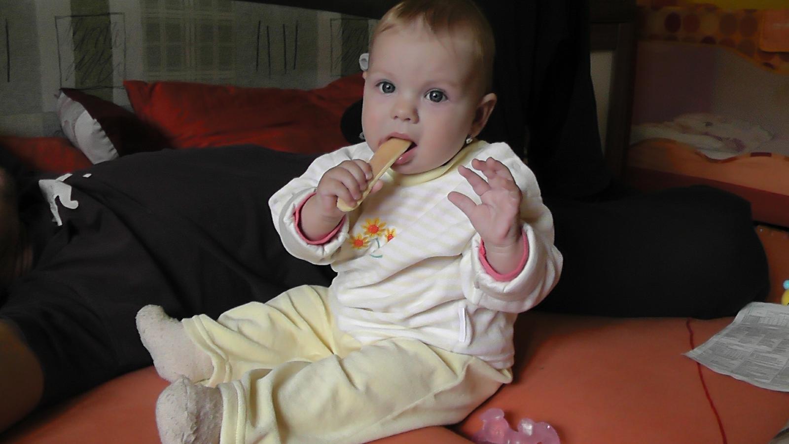 Baby, idem sa pochváliť trošku aj ja. Tak my sedíme bez problémov, máme dva spodné stredné zúbky a (nechápem prečo) tretí vyšiel horný ľavý očný... po 4 chodí Alexia od utorka a najradšej by chodila po dvoch, aj sa sama postaví či na posteli alebo v postieľke. Asi sa chcela ukázať tatovi aká je šikovná, prišiel totiž po 2,5mes. 🙂