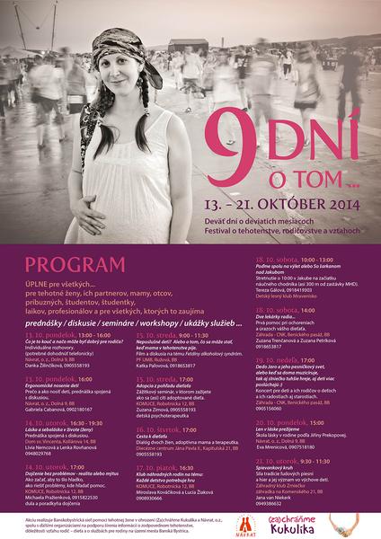 dávam do povedomia festival 9 dní o tom, ktorý práve začína v BB. Možno Vás oslovia nejaké témy, pozrite priložený plagát. Ja osobne Vás pozývam na stretnutie o dojčení, ktoré bude v utorok 14.10. o 17,00 hod v KOMUCE na Robotníckej 12.