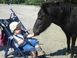 Baby tak dnes sme mali super dopoludnie 🙂 tato chcel sice pol dna prespat , ale ukecali sme ho a zobral nas na vylet. Nasli sme kusok od nas super farmu so všelijakými zvieratkami, kone, husi, emu, poniky, somare, kacice, no proste farma a maly bol taky vyteseny. Ani kona sa nebal, kdesto ja sa bojim jak .... 🙂