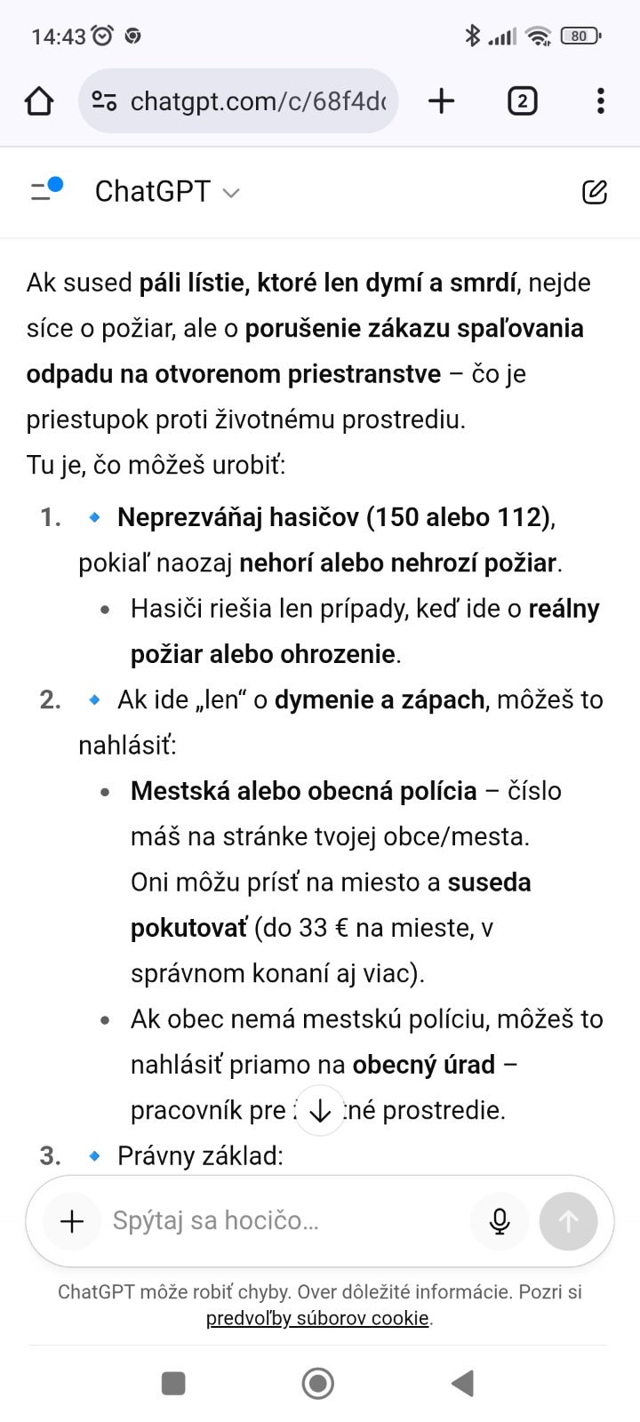 Ako sa stavať k tomu ak sused už tretí týždeň páli mokré lístie a iný bordel? Dohovor nestačil. Dusím sa od hustého dymu. Povedal že uhasí a zas celé hodiny dymý. Zalezený dnu, ako by tu ani nebol.