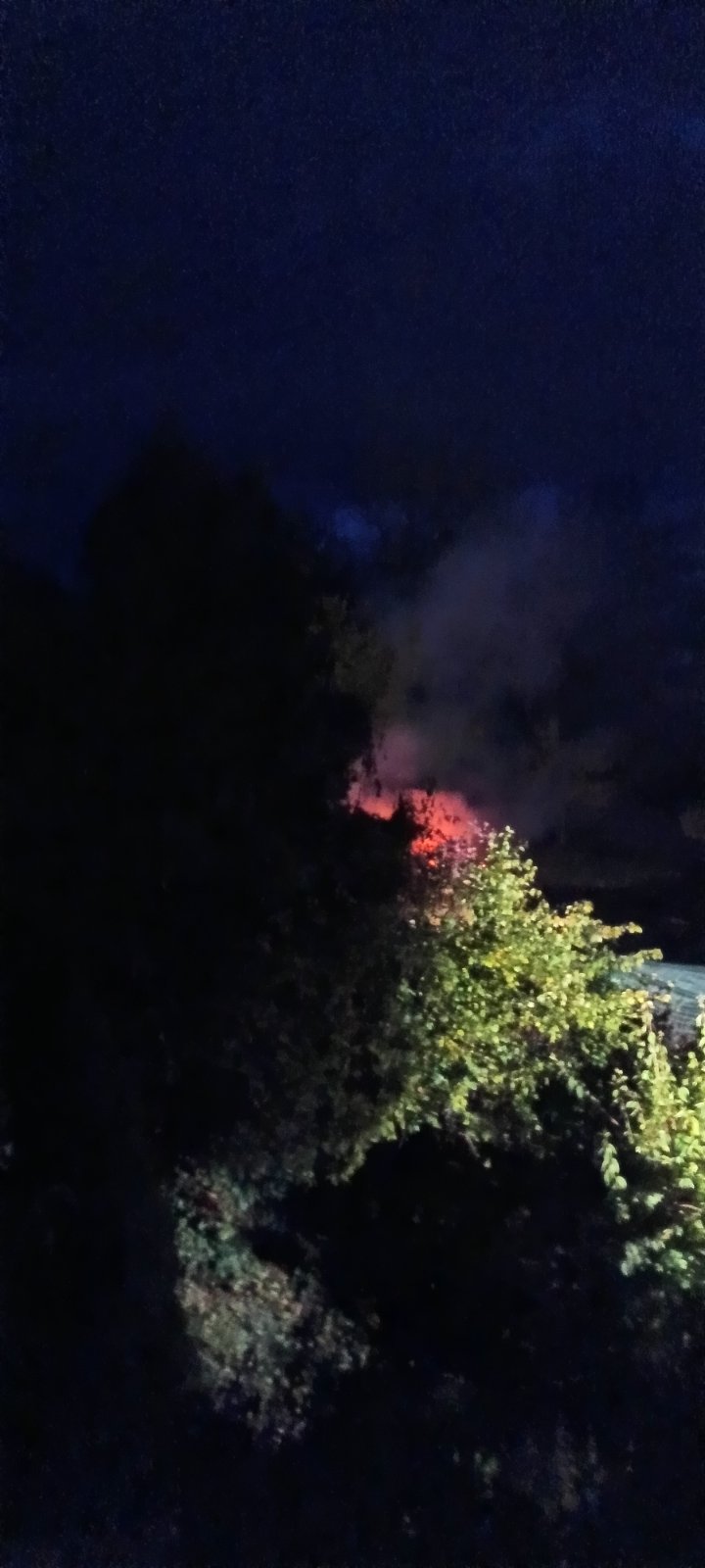 Veď to. My sme mali včera večer veselo. Toto som fotila okolo ôsmej večer. Susedia, bratia okolo 50, večne naložení v liehu, sa vôbec nestarajú o záhradu. Takže prvé kosenie metrovej buriny bolo asi pred 2 týždňami. No a včera večer volala jedna suseda, že zase pália. Pri pohľade z našej spálne v podkroví to vyzeralo takto (asi meter za tými kríkmi je náš plot):