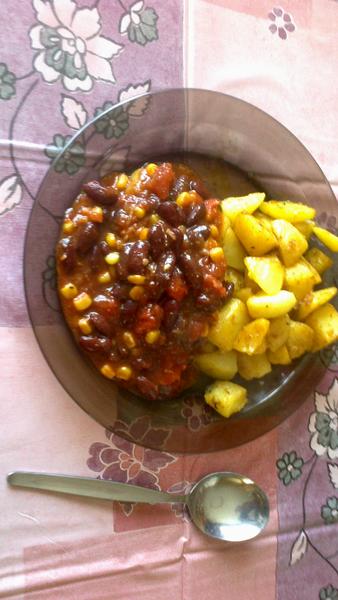 Na lyzicke oleja som oprazila malu cibulku, dva struciky cesnaku, supla na to krajane lupane paradajky z konzervy, pol plechovky kukurice, cervene fazule v tomate, zamiesala, povarila a okorenila (chilli, ml.čierne korenie, oregano,