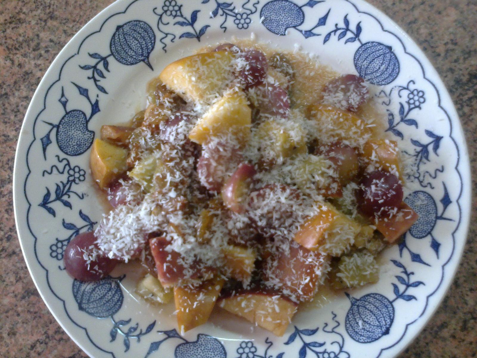 @1veroncek1 ja som to robila uz aj s jahod, bananu a ringlond + malin v lete ked som drzala ten mesiac .... a bolo to mnam ....hrozienka odporucam hodit do zalekacej misy spolu s ovocim aby nasiakli chutami - tou stavou co tam vznikne .... a nakoniec hotove uz len posypat kokosom 🙂
